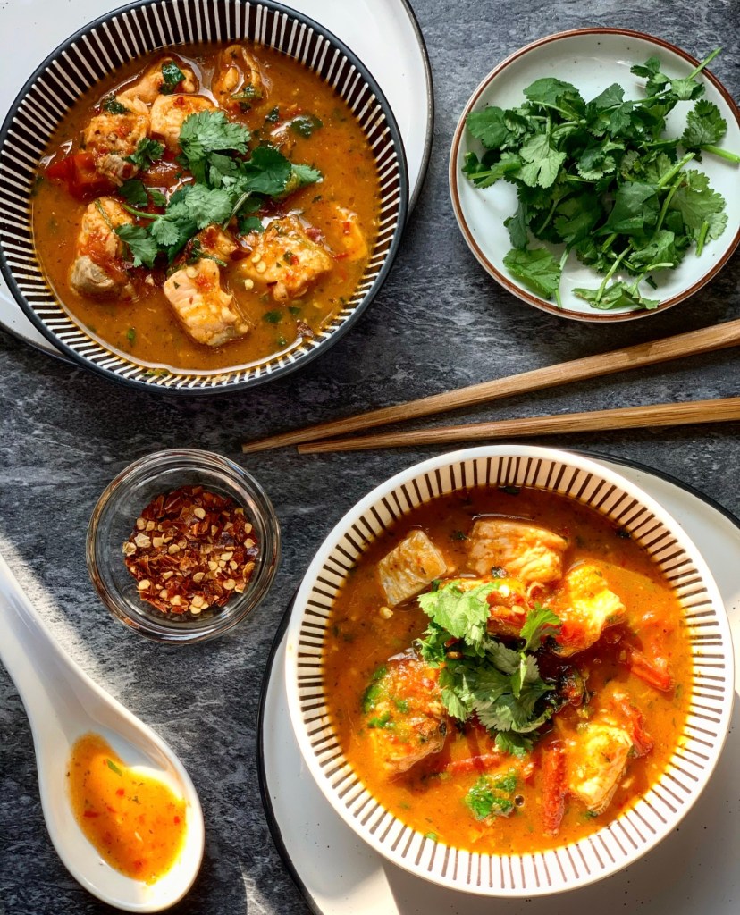 The complexities of the different flavours in the paste means you want something gentle and delicate with this. I wouldn’t necessarily recommend anything beefy, porky or chickeny – this soup was designed perfectly for seafood and soft, gently flaky fish . Of course, eat it with whatever you want but that’s my stand on it.