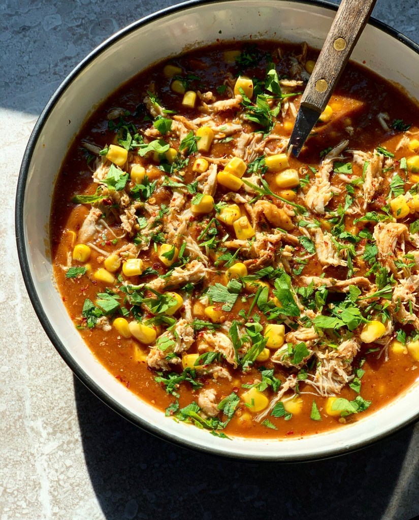 Allow the soup to bubble for like… 5 minutes just to heat up the beans/corn you’ve added and serve in big bowls with some fresh coriander.