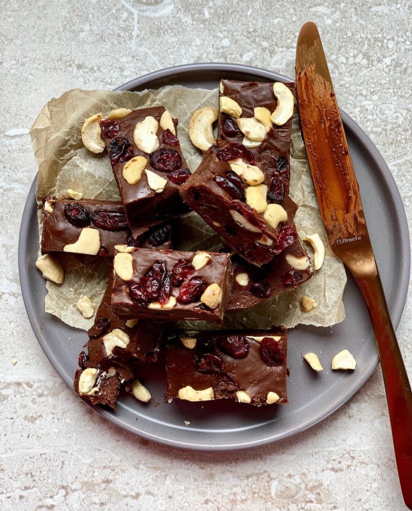 Add a handful of dried cranberries and a handful of cashew nuts which you’ve bashed up into shards. You could vary this combination as you see fit – I’ve been more than pleased with a cherry and pistachio combination before now. You could even omit these additions and just go for a Salted Chocolate Fudge. There’s no bad way to enjoy this.