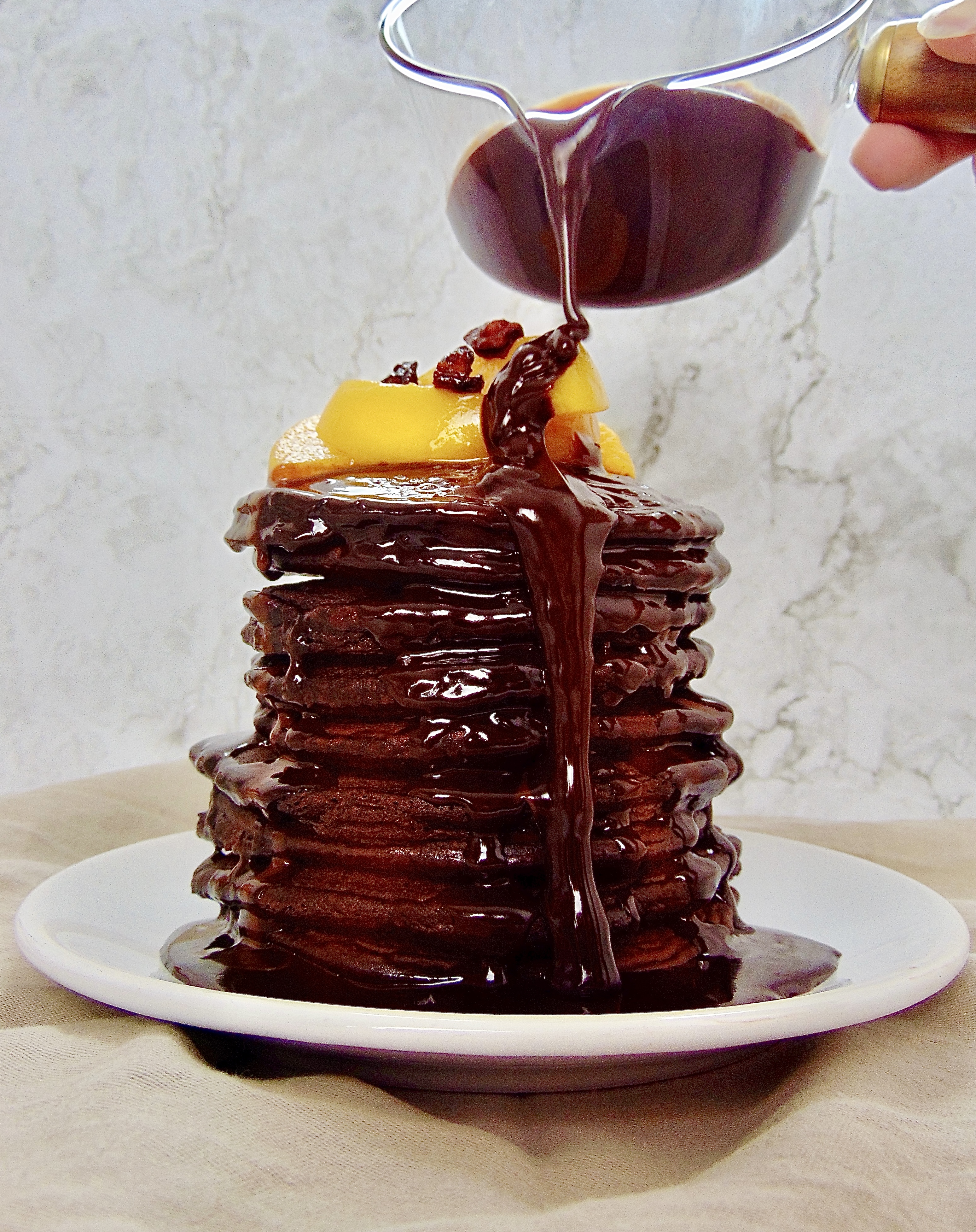 - Divide the pancakes to plates, stack as you see fit and then top with the poached peaches. If you want the glossy spiced peach spiked chocolate sauce you see in the picture, just see the intro.