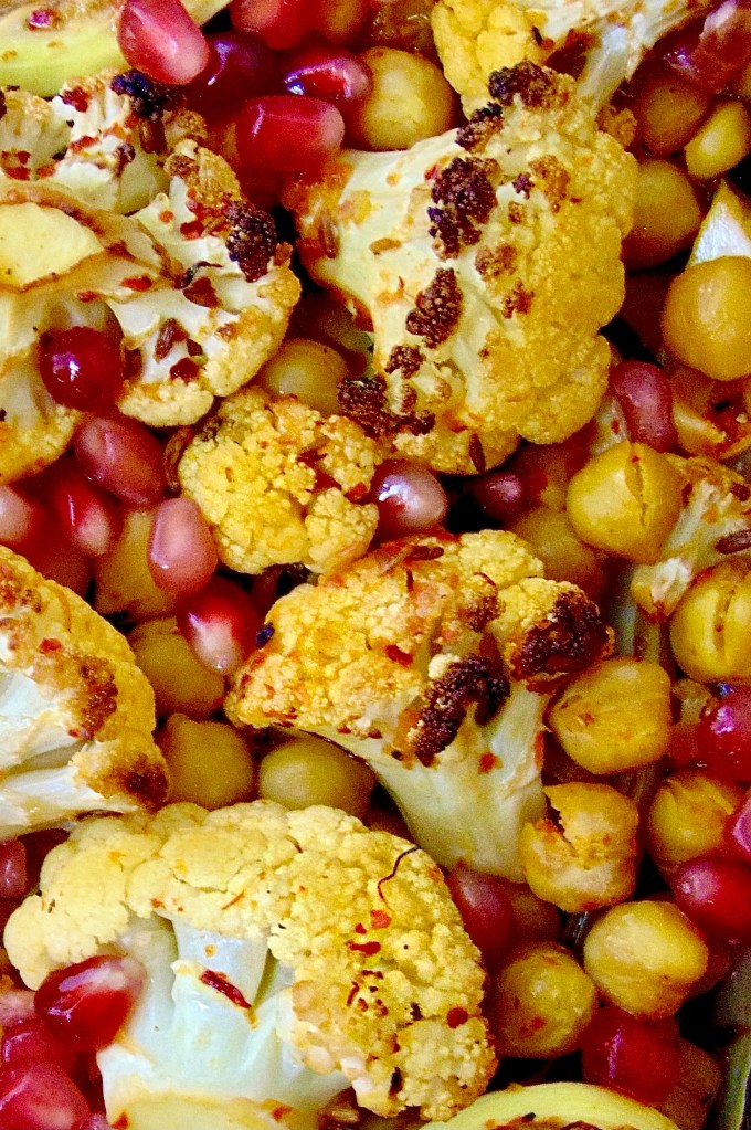 - Once the cauliflower has had it’s 25 minutes, take out of the oven, pour in the bowl of chickpeas, and any juices left in the bowl, rustle them amongst the cauliflower and pop back in the oven for another 10 or 15 minutes.