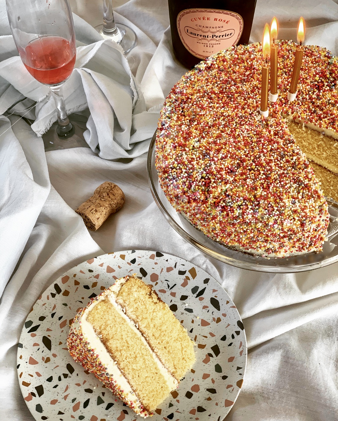 - If you want the sprinkle look you see in the picture, once you’ve smoothed your cake with a warm spoon, empty 160 g of sprinkles into a flat roasting tray.