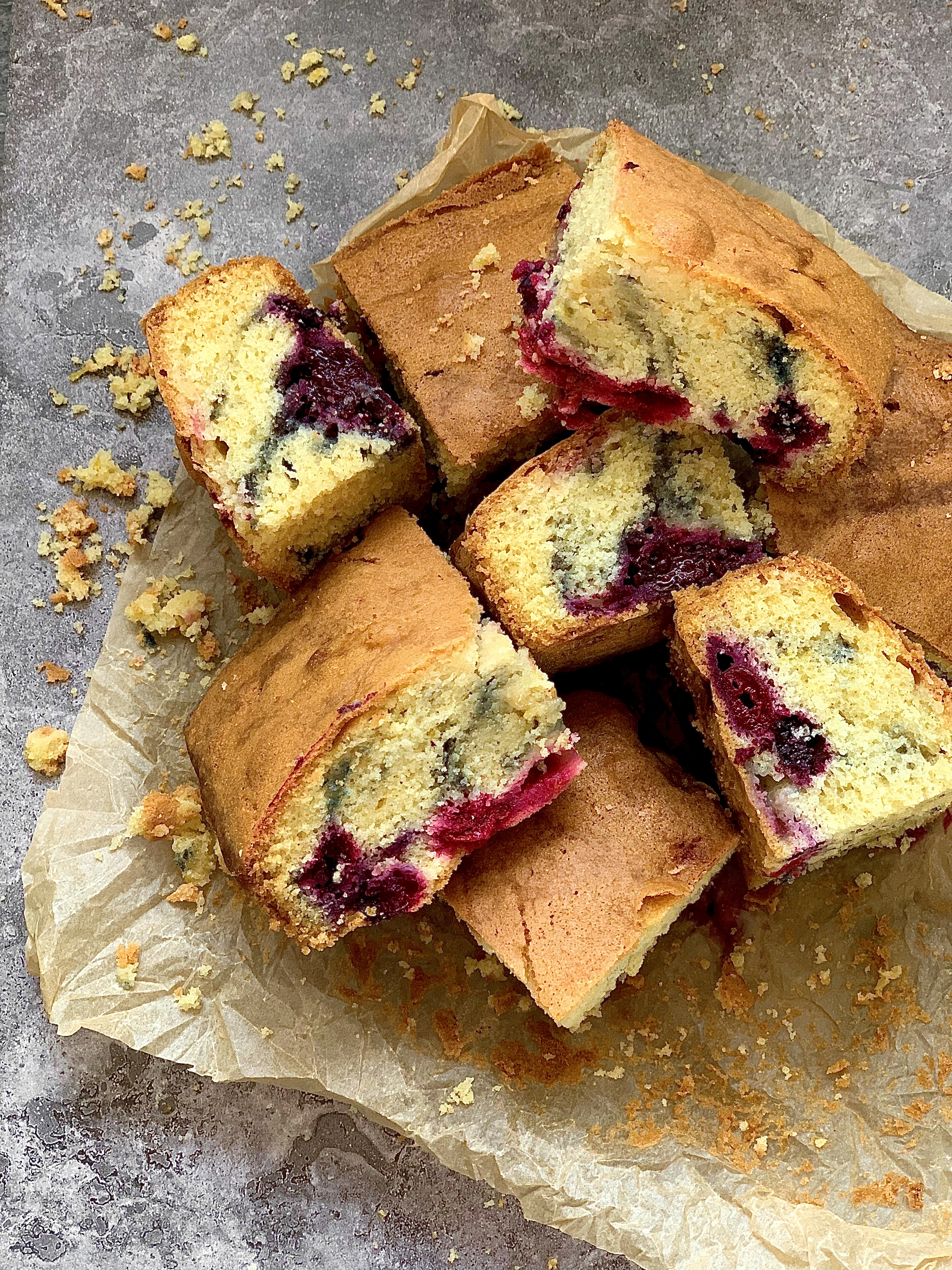 The choice of frozen mixed berries over a singular fruit was not a calculated one but a product of circumstance because that’s what I had in the freezer, I see no reason why you couldn’t swap out the mixed berries for a more restricted fruit choice i.e. just strawberries, just cherries, just blackberries etc, I would just keep the weight at 150g. But I actually quite like the mix of fruit in the cake, it gives each wedge a different point of interest as well as a tapestry of colour.