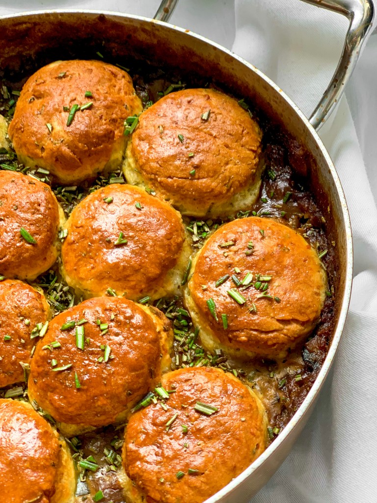The general jist is, you make the stew in advance, which is a hob-to-oven affair (it’s all very hands off save for some light chopping and stirring, as any stew would demand) and then you let that sit in the fridge until you’re ready for it. In this time, you can roll out your cobbler dough, cut it into shapes, and then stash these in the fridge too. Then when you’re ready, you just heat up the stew, pop the cobbler on top, and then put it in the oven.