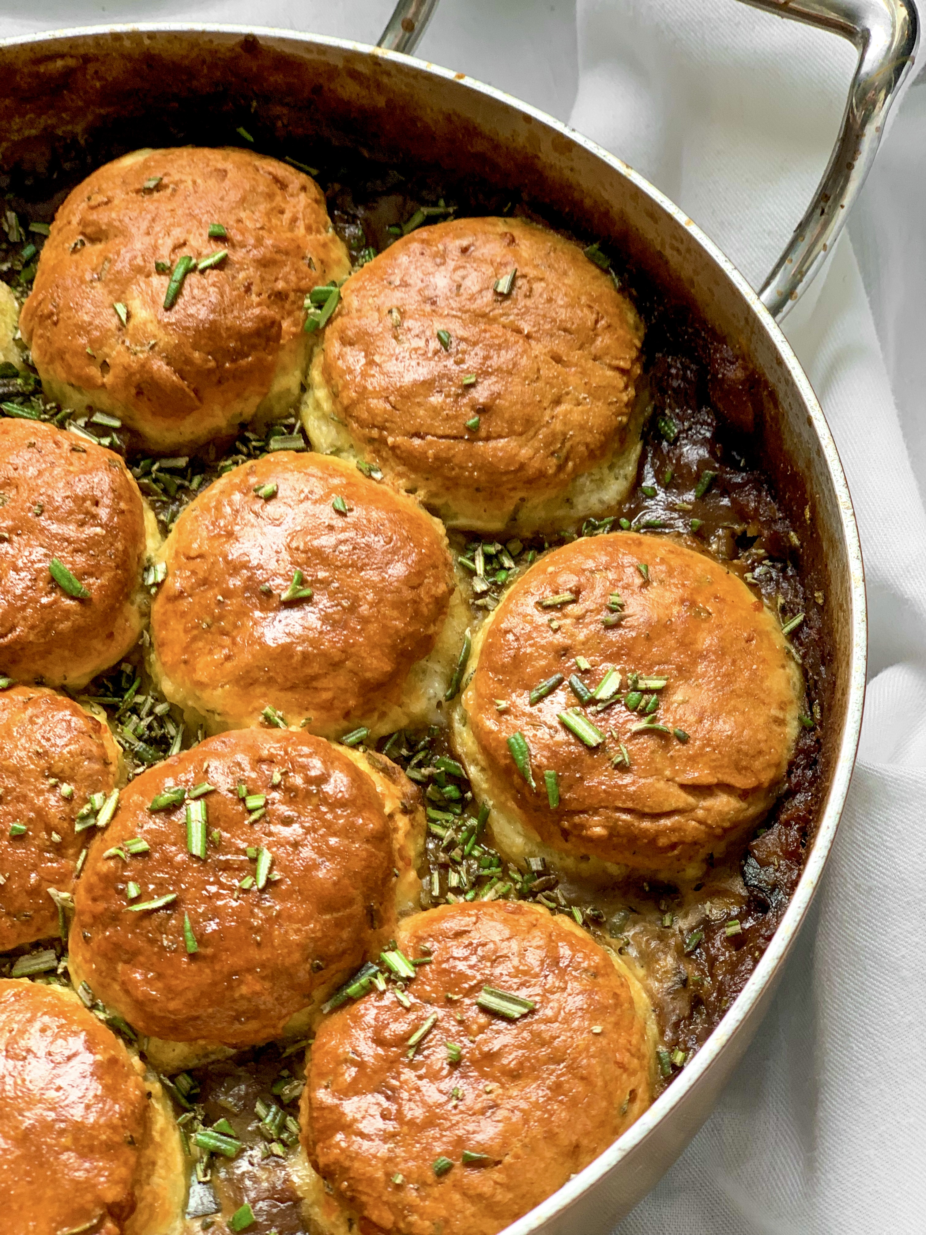 The general jist is, you make the stew in advance, which is a hob-to-oven affair (it’s all very hands off save for some light chopping and stirring, as any stew would demand) and then you let that sit in the fridge until you’re ready for it. In this time, you can roll out your cobbler dough, cut it into shapes, and then stash these in the fridge too. Then when you’re ready, you just heat up the stew, pop the cobbler on top, and then put it in the oven.
