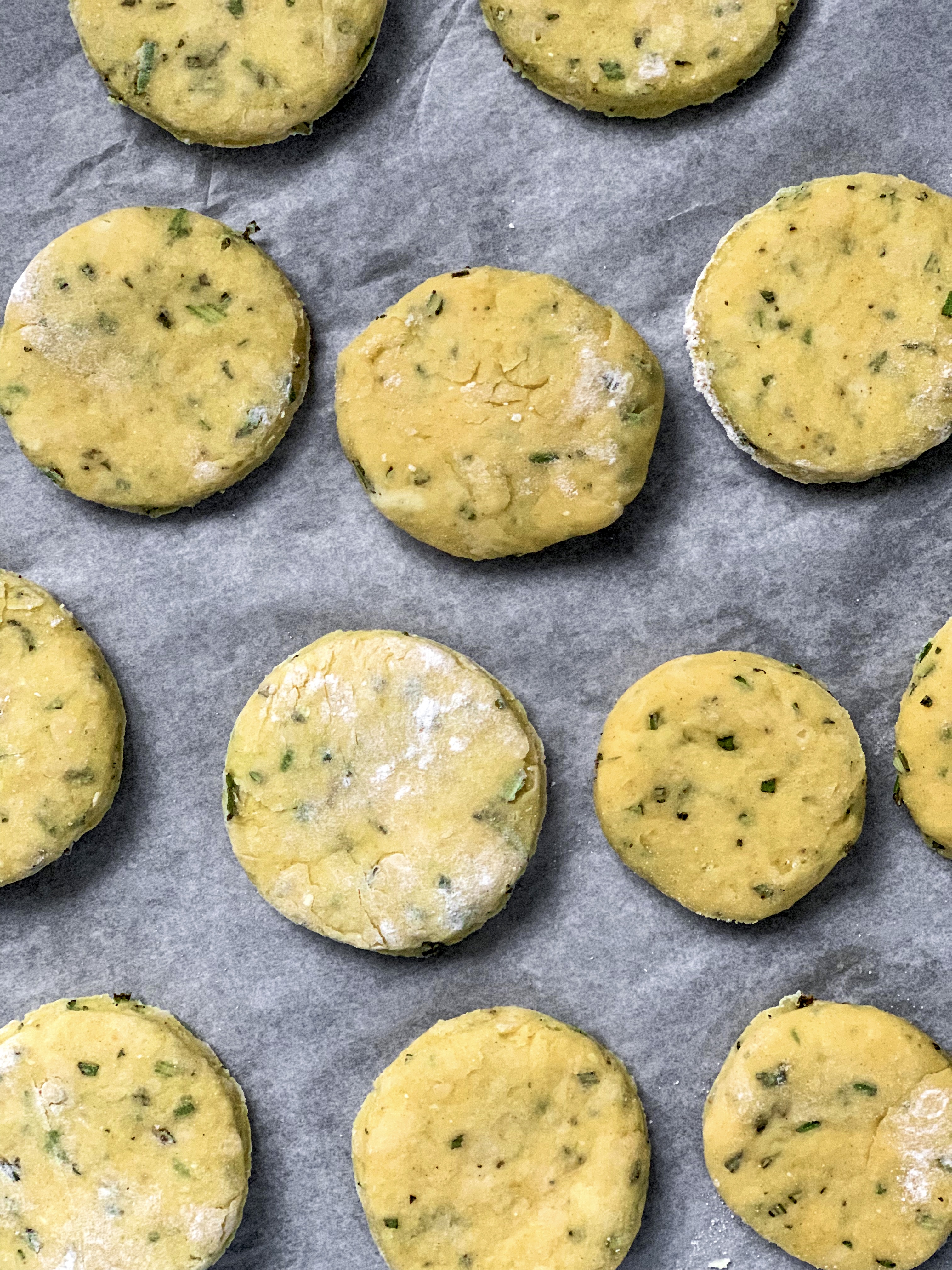 - With a rolling pin, roll the dough out to roughly 1cm thick and using a shotglass or a very small glass tumbler, cut little rounds out of the dough, and using a gentle hand, transfer to the lined plate or board. Ball up the scraps of remaining dough, roll out to 1cm thick again, and continue to cut out shapes. Repeat this process until you have used up all of your dough.